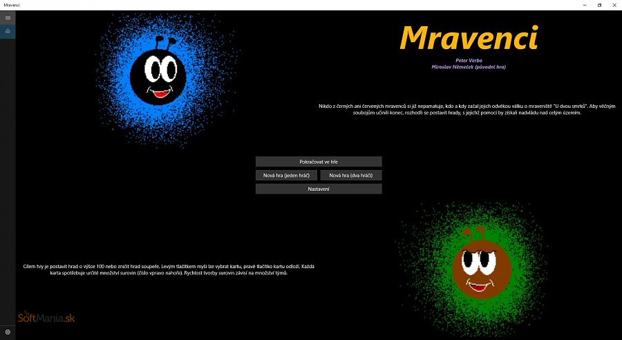 Mravenci je strategická kartová hra inšpirovaná klasikou Arcomage z Might & Magic 6. V odvekom boji červených a čiernych mravcov je cieľ jasný – postaviť vlastný hrad do výšky 100 úrovní alebo zničiť hrad súpera. Pomocou magických, vojenských a staviteľských kariet musíte šikovne plánovať každý ťah, aby ste získali prevahu. Hra ponúka režim pre jedného i dvoch hráčov, viacjazyčnú podporu a pripravovaný online multiplayer pre ešte väčšie výzvy.